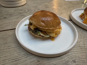 Servis - Opečená houska, spodní část pomazaná chorizo taveňákem, na tom marinovaná cibulka, na tom salát, na salátu sýrová omeleta, na omeletě je ještě zakápla sriracha.