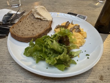 Servis - Míchaná vejce posypaná čerstvým lanýžem, na straně salátek, krajíc chleba a šlehané máslo