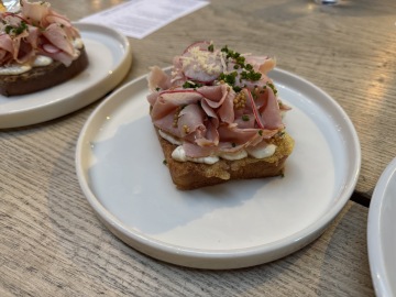 Servis - Opečený toustový chléb, pomazaný lučinou, na lučině nakládaný fenykl, na něm šunka od kosti a jako garnish ředkvička, hořčičné semínko a micro greens